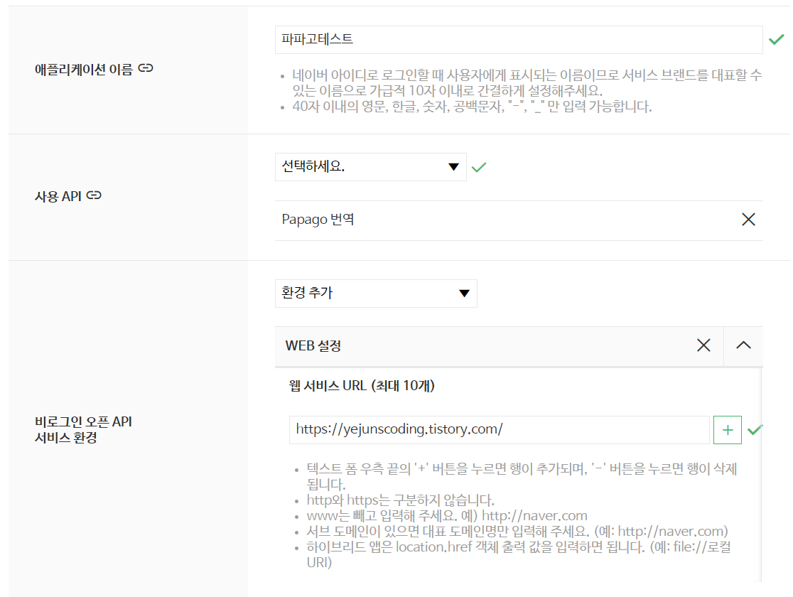 자신의 어플리케이션 이름을 어플리케이션 이름란에다가 쓰세요 저는 "파파고테스트"로하겠습니다
